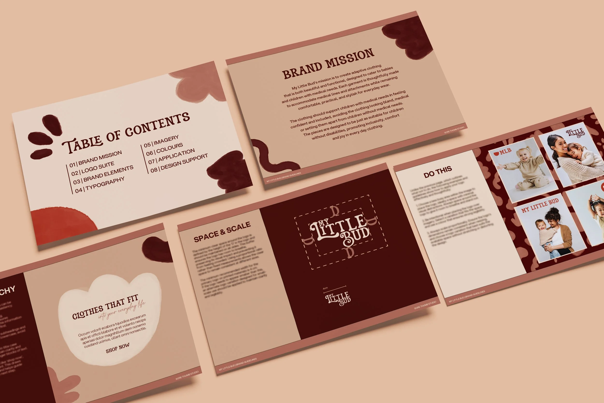 My Little Bud creates adaptive clothing that is both functional and beautiful, designed to support babies and children with medical needs while feeling just as perfect for those without. The branding focused on inclusivity, empowerment, and joy, helping every little one feel confident, comfortable, and included. The identity features a simplified rose bud illustration and a subtle rose bud within the letter ‘B’ of the primary logo, a thoughtful nod to the brand’s inspiration. The final visuals balance a clean, minimal foundation with soft watercolour details that convey warmth, care, and playfulness. The project included a complete logo suite, custom watercolour brand elements and patterns, complementary fonts, and a detailed brand guide with visual mockups and a one-page cheat sheet.